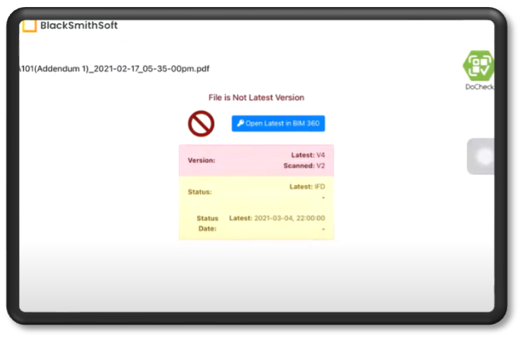 A foreman can simply scan the QR code printed on a drawing and get a simple yes/no answer: is this drawing up to date, or not? That quick check at the start of the day can prevent an entire crew from working off an outdated set.